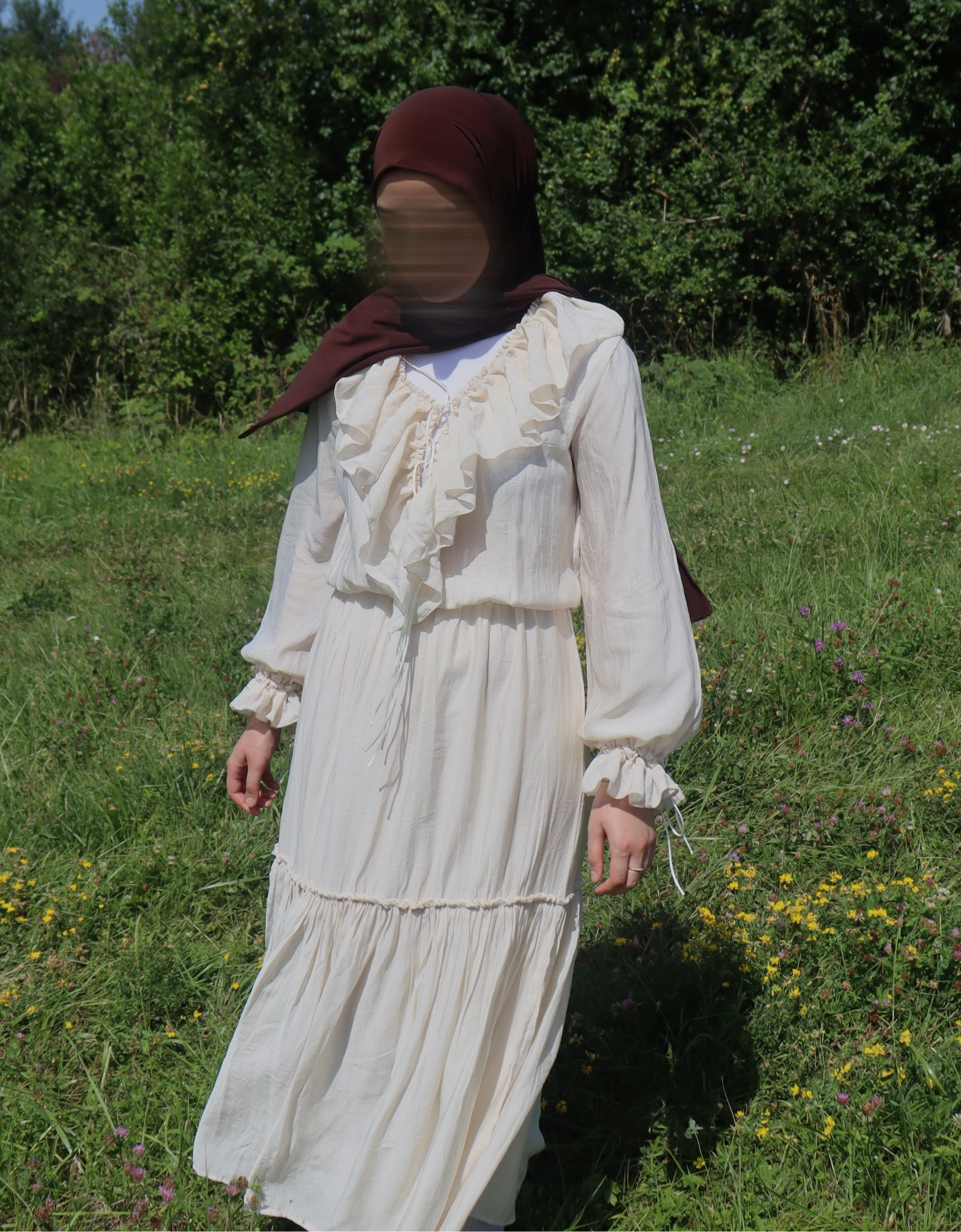 Avec ses volants délicats et sa teinte nude, cette robe sublime toutes les silhouettes avec douceur.